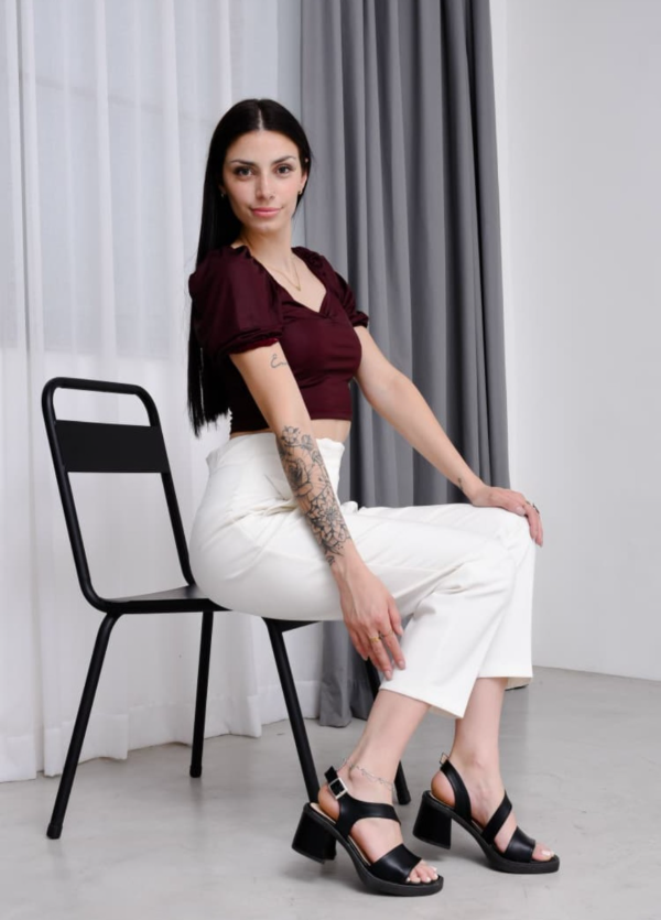 Sandalias de cuero ecológico, con tira cruzada para darle un toque extra al modelo. Taco súper cómodo de 6 CM aprox