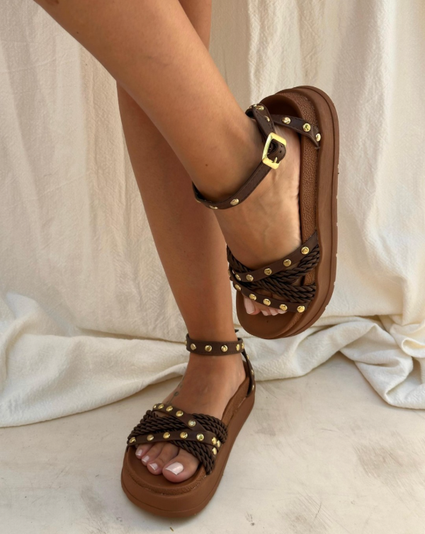 Sandalias para todos los días, con base de expanso, trenzadas y con tachas. Hebilla regulable