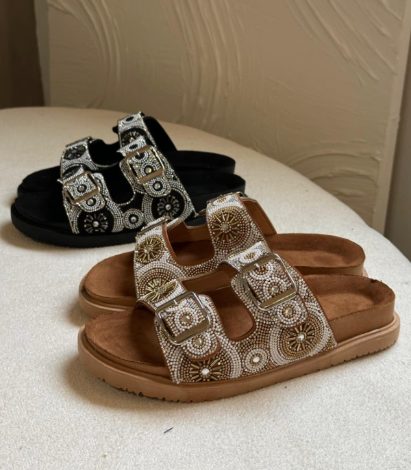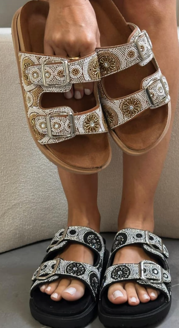 Base inyectada de goma, súper livianas y cómodas. Plantilla forrada y capellada full strass