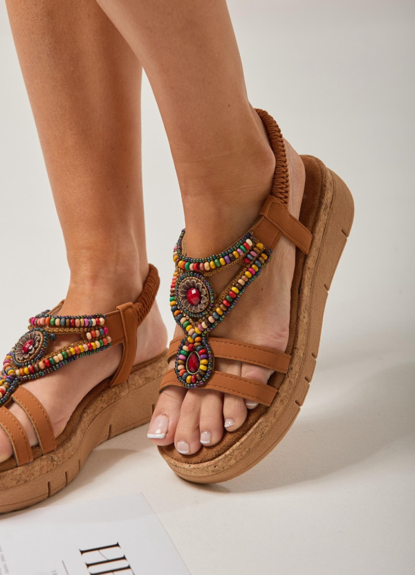 Sandalias con elástico trasero y capellada importada de canutillos y piedras. Base de expanso, tipo corcho .