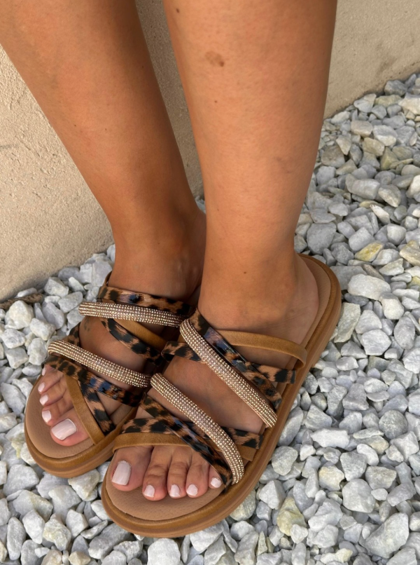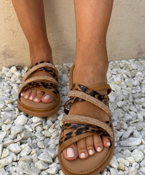 Sandalias planas con capellada combinada de strass y cuero ecológico premium. Cómodas y livianas por demás!