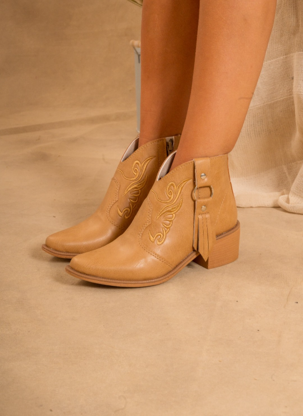 Texanas cortitas, con bordado en la capellada de cuero ecológico. Con cierre lateral, y taco símil madera de 5 CM de altura.