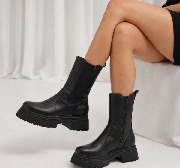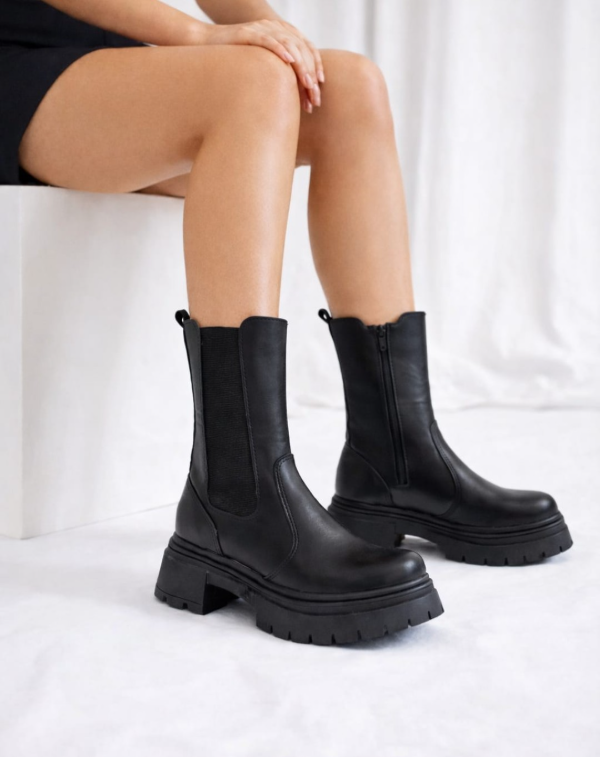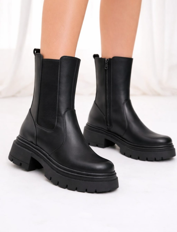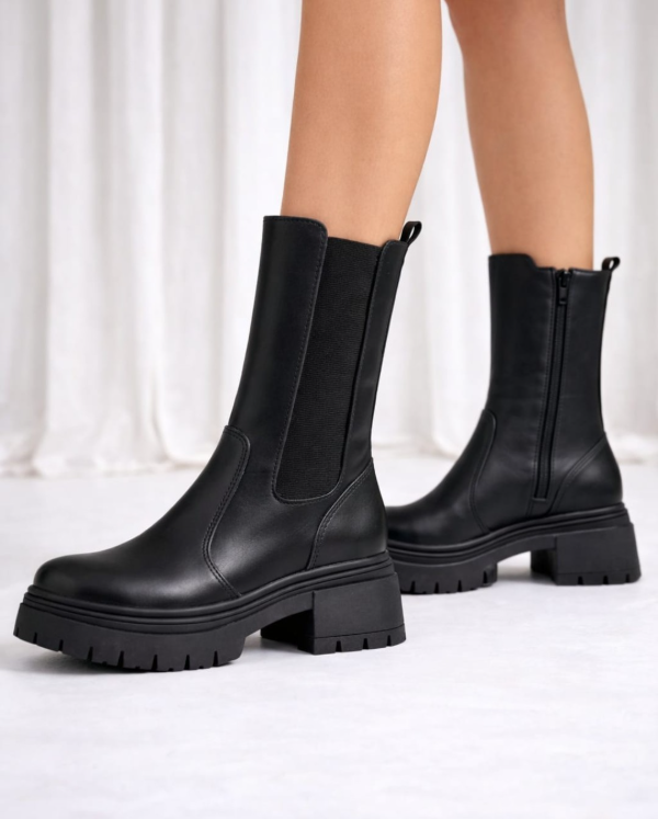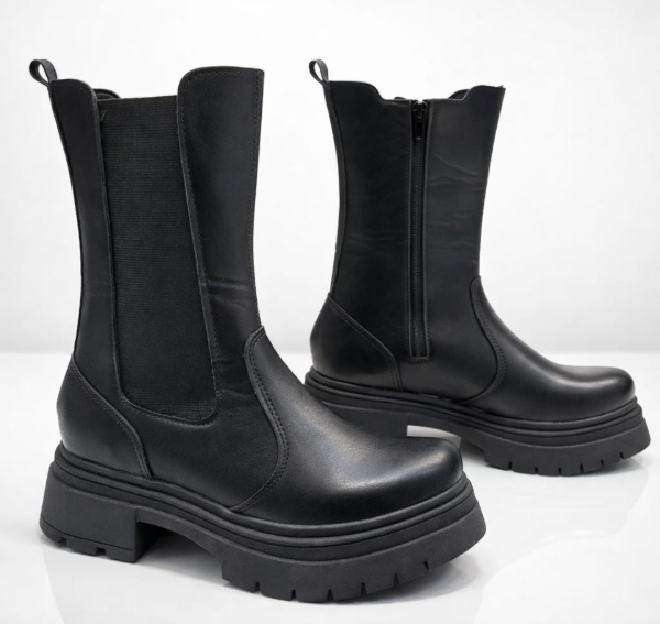 Borcegos caña media, con elástico laterales para mayor practicidad. De cuero ecológico premium. Taco de 6 CM aproximadamente. Cómodos y livianos.