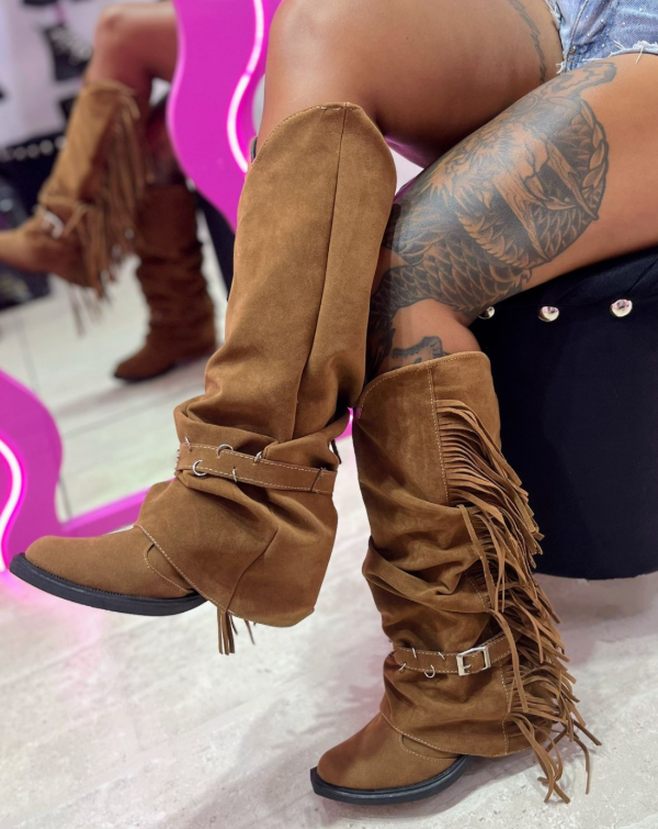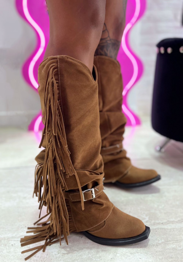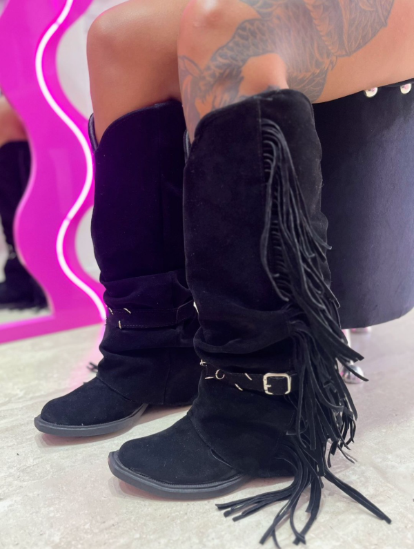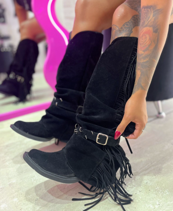 Texanas gamuzadas con detalles de argollitas. Hebilla y solapa volcado. Con taco súper cómodo! Base liviana. Y flecos para darle un toque aún más canchero