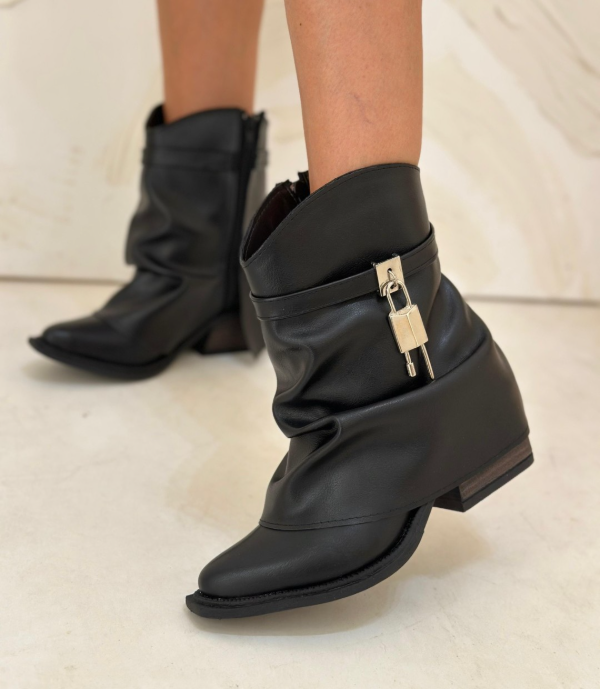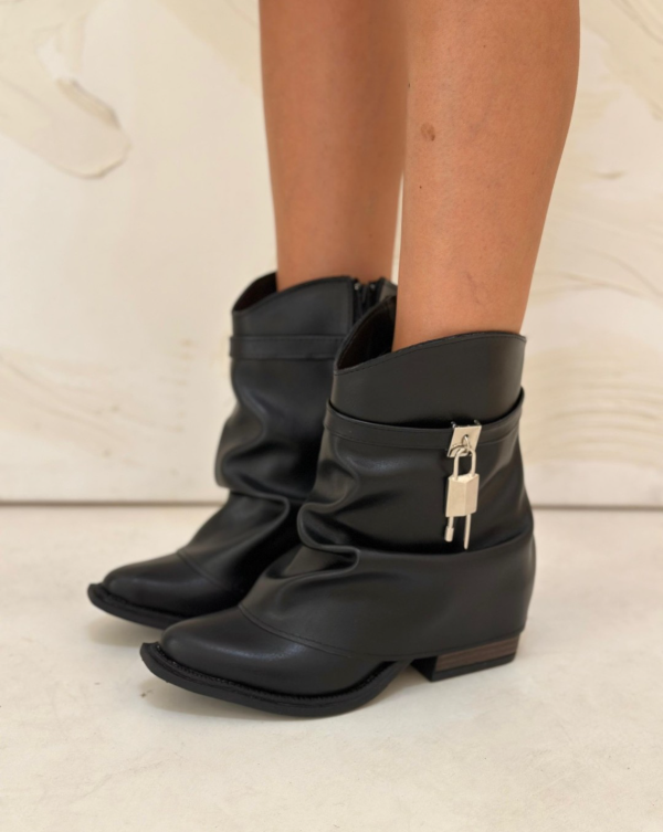 Texanas caña corta con solapa y detalle de costado candado. Taco de 6 CM aprox. Son súper cómodas y de cuero vegans
