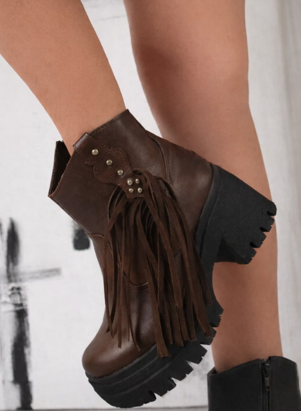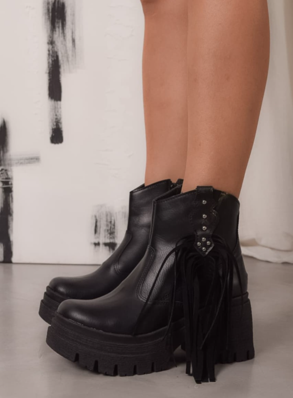 Borcegos de cuero ecológico con flecos laterales y tachas . Taco de 7 CM aproximadamente.