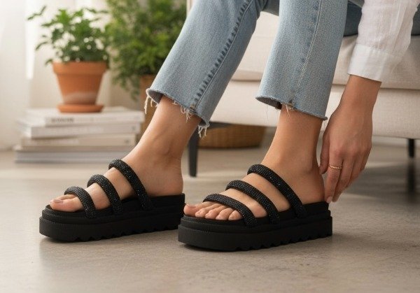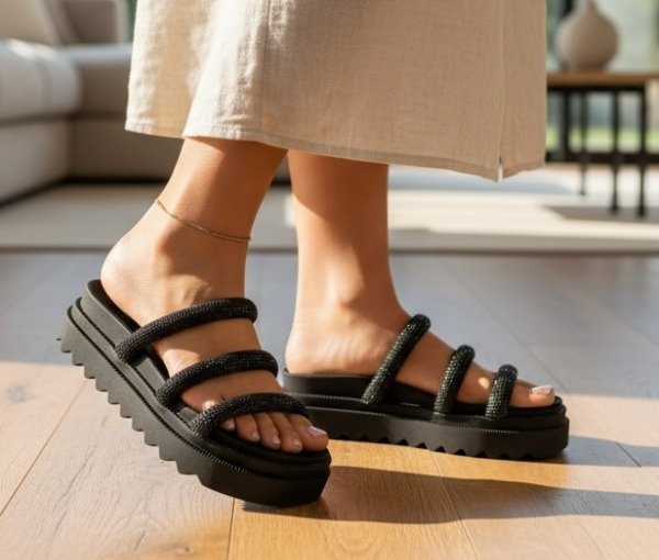 Capellada cubierta de full strass, base de goma Eva súper livianas y cómodas.