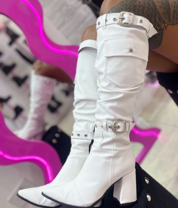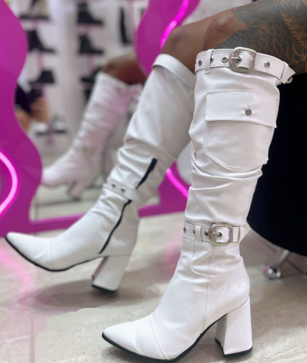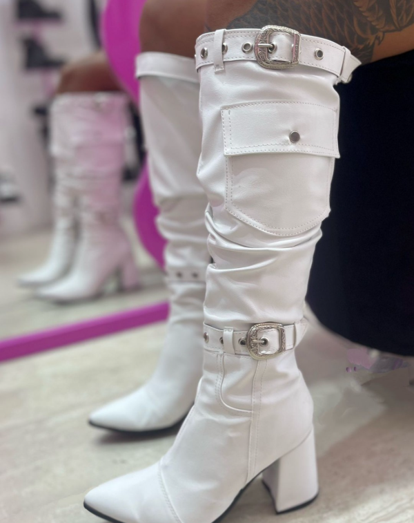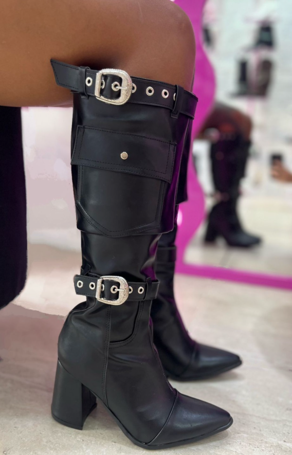 Botas caña alta de cuero vegans, con herrajes, hebilla y bolsillo lateral. Taco de 10 CM aproximadamente